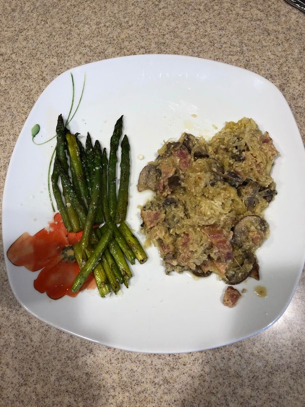 Christmas is only a few days away. There are lots of parties to go to and lots of foods that are hard to pass up. My plan is to stay on my low carb meal plan as much as I can. There will be some cheating but we have to reward ourselves for doing well most of the time. Eat sensibly and stay away from the carbs if you can. Here's a delicious dish that we've come up with that is very carb friendly. It's Bacon Carbonara with asparagus. We used spaghetti squash in place of pasta. It tastes delicious. So far I'm down 21 pounds since October 1. Hoping to get down a few more and stabilize. I'm trying to loose the weight in hopes that my cholesterol will go down and I'll be healthier. It's all about motivation and self control when eating. Hope you have a very Merry Christmas.
