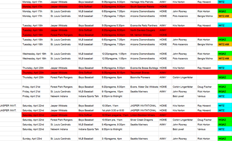 Jasper/Huntingburg/Ferdinand - Ahead this week on the airwaves, a full slate of Jasper and Forest Park Baseball, plus dual broadcasts (English and Spanish) of St. Louis Cardinals Major League Baseball.